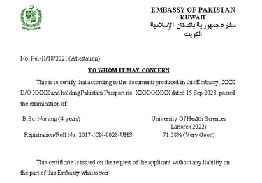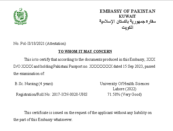 Submit the following documents along with the grading letter to the Embassy of Pakistan for attestation: